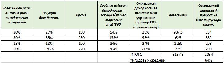 Поскольку у каждого управляющего разная степень просадки, то решаем несложное уравнение, чтобы получить сумму, которую мы готовы инвестировать согласно нашим ожиданиям в 15 % по риску.