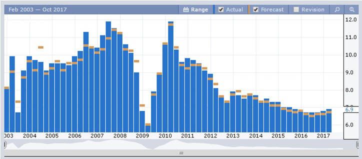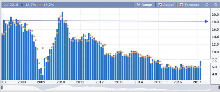 На графике видно значительное снижение в период кризиса 2008 года и до конца 2009 года. На данный момент, если сравнивать с периодом 2000-2008 гг., показатель выглядит не хуже, чем в докризисный период.
