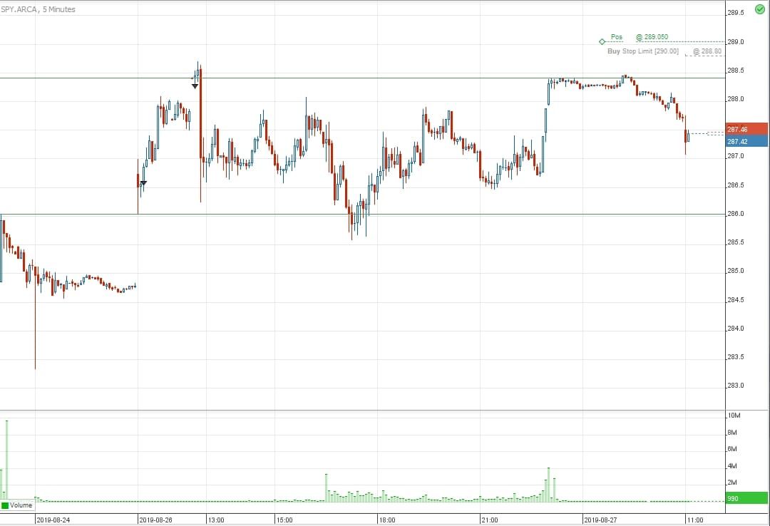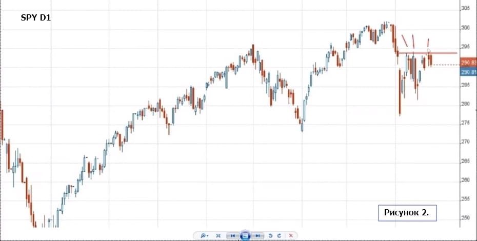 Реализацию сделки я выбрал через SPY, впрочем, аналогично можно было и через SPX500. По SPY также видно чёткое сопротивление на дневном графике.