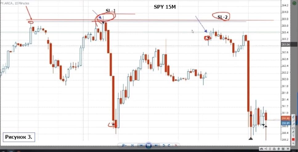 Второй вход, честно, не сильно мне нравился технически из-за более отдалённого обоснованного стопа, но по характеру хода и внешнему фону было понятно, что высока вероятность падения SPY.