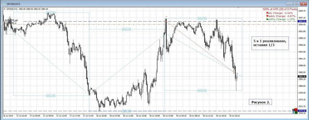 Как и предыдущая сделка (рис.1), где было реализовано 9 к 1 в соотношении прибыли к риску, так и текущая, всё ещё открытая сделка по индексу SPX500, где уже забрал 5 к 1 без учёта открытой части, может показаться решением лёгким и непринуждённым (рис.2).