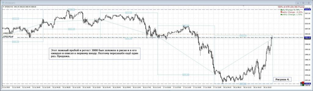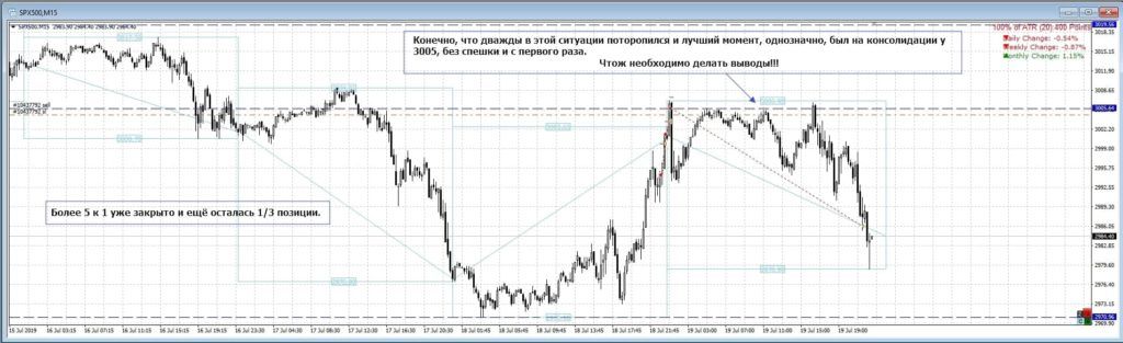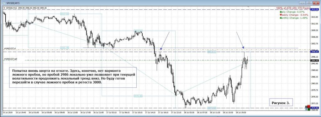 Уже в описании становится понятно, что несмотря на то, что я глобально видел продолжение движения вниз, но присутствовали явные сомнения, что локально инструмент пойдёт здесь и сейчас и от цены 2998, «но буду готов перезайти в случае ложного пробоя 3000».