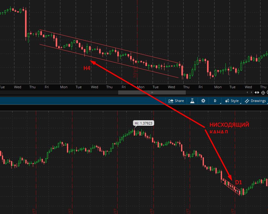 Аналогичный пример нисходящего канала в паре USD/CAD на Н4 и D1, сформированный в июле текущего года.
