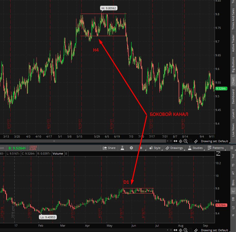 Это основное отличие бокового канала от бокового флета (проторговки), где цена вяло скачет около определённой цены при низко ликвидном рынке, так как нет институциональных ни продавцов, ни покупателей.