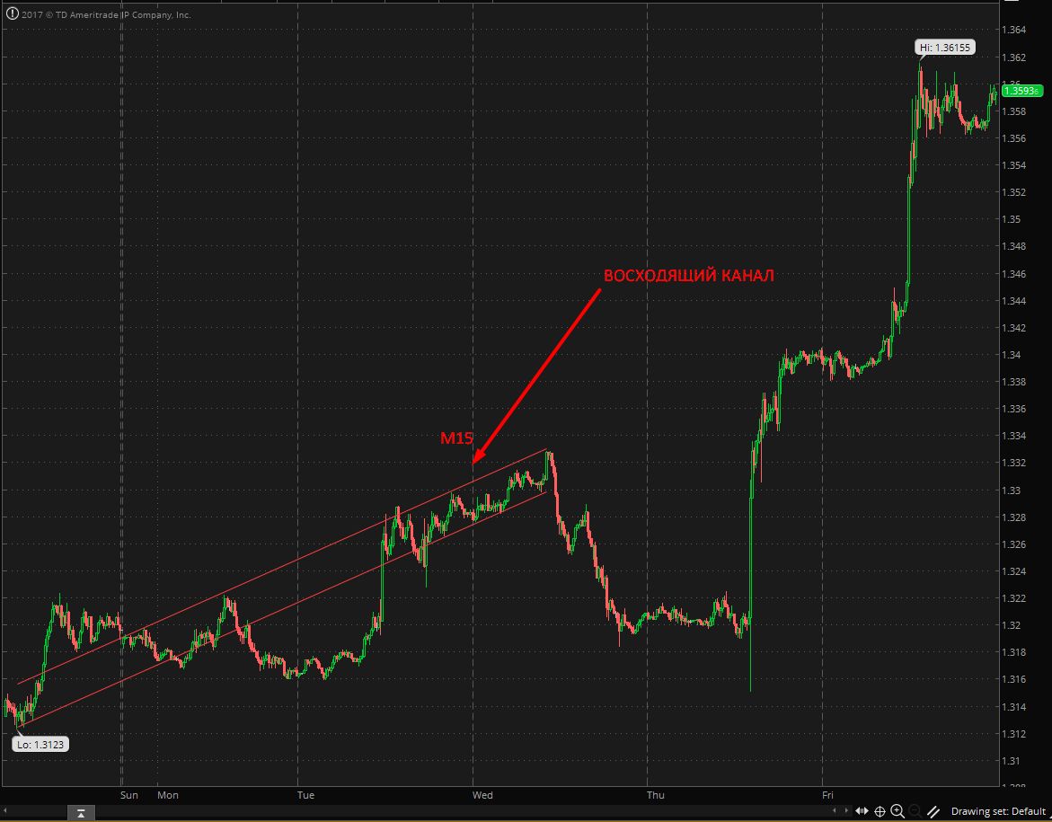 Пример канала с пробитием на М15, сформированного на текущей недели в очень интересной сейчас волатильной паре GBP/USD.