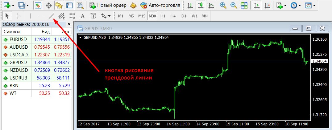 Второй способ. Ним пользуются большинство трейдеров. В той же панели инструментов выбираем «рисование трендовой линии».
