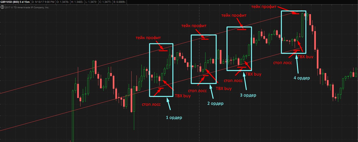 Пример торговли восходящего канала пары GBP/USD на М15 с отмеченными точками входа, а также указанными уровнями стоп лосса и тейк профита.