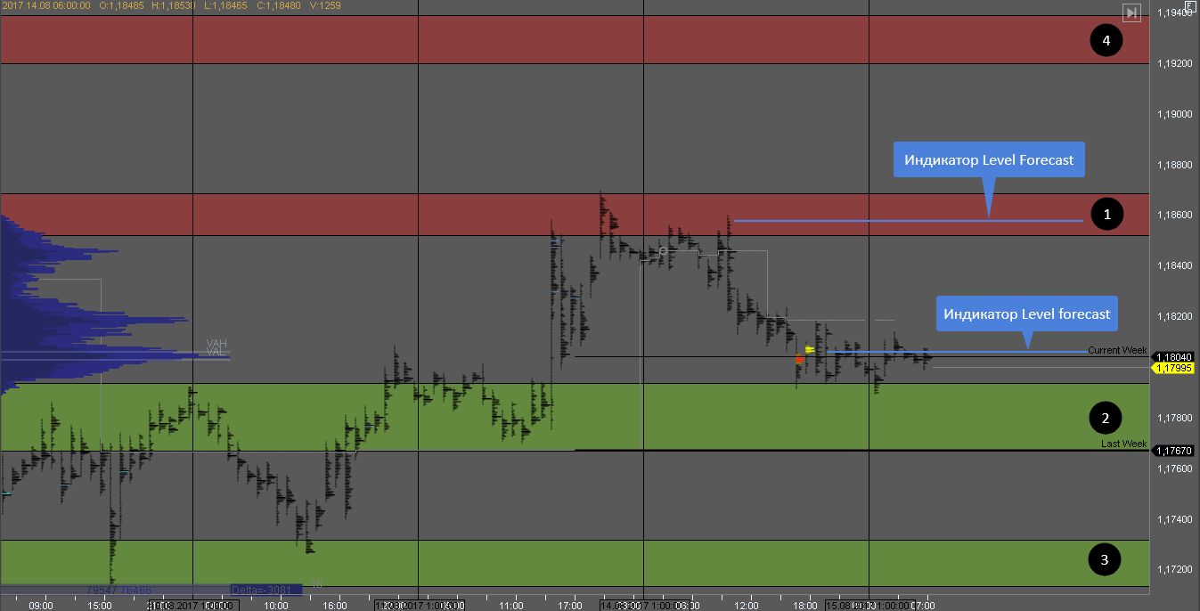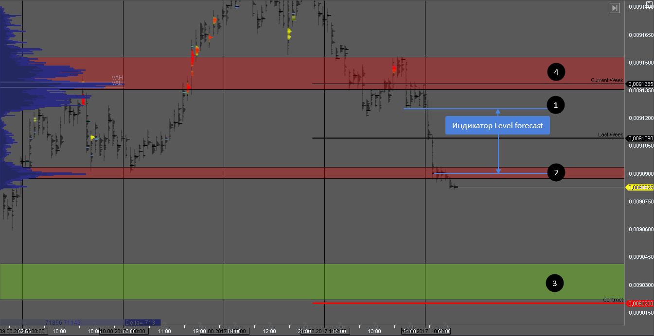 На данный момент формируеться новый объем в локальной консолидации с уровнем индикатора Level forecast над зоной 2. В случае пробоя этого объема вверх, покупки могут возобновиться. Цели роста в зонах 1 и 4.
