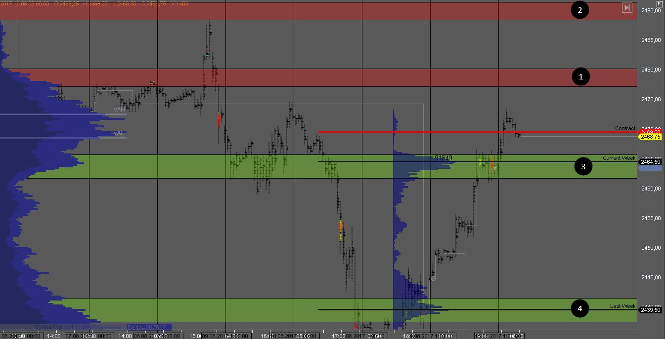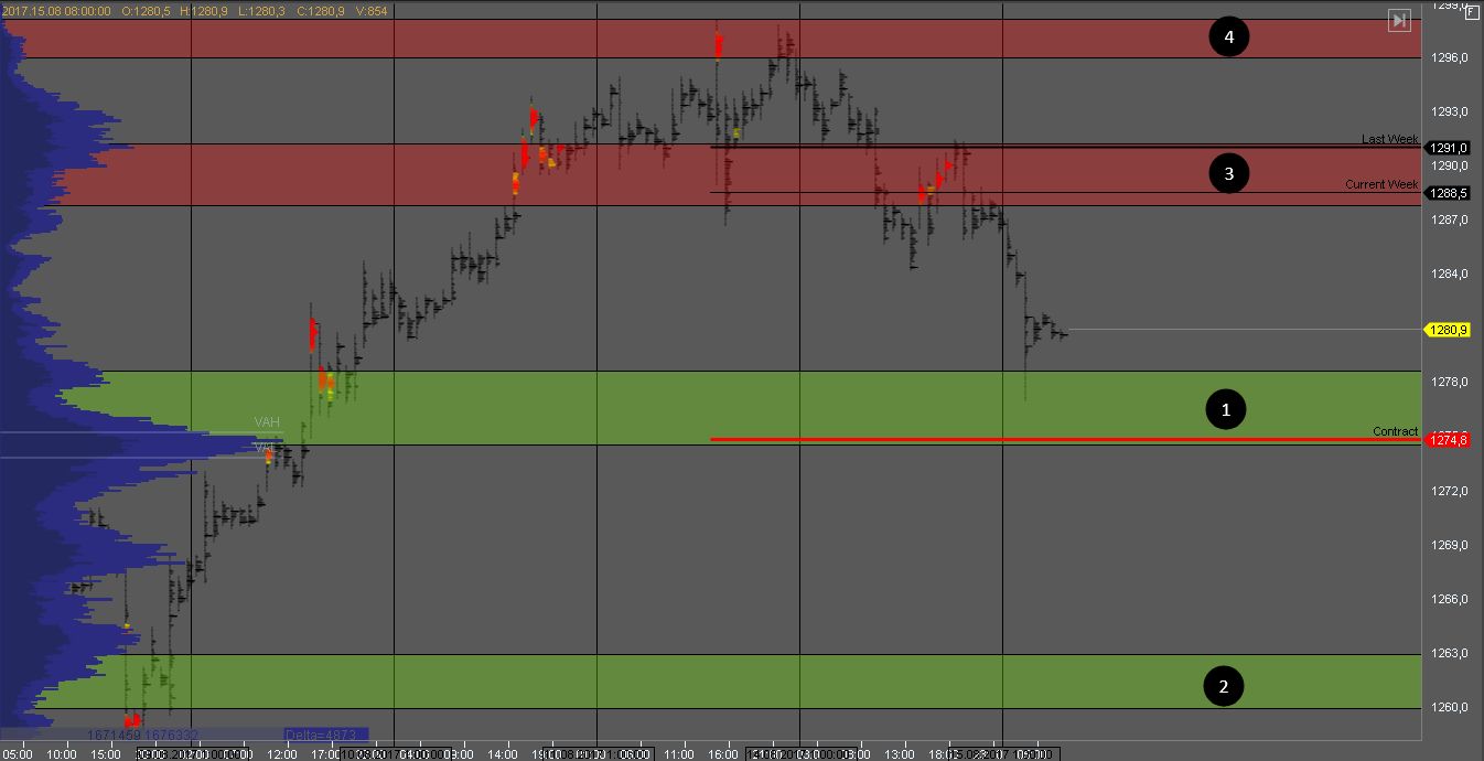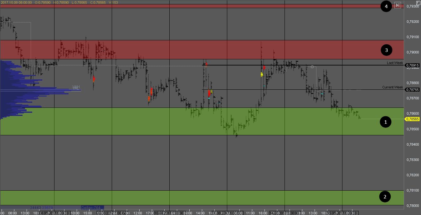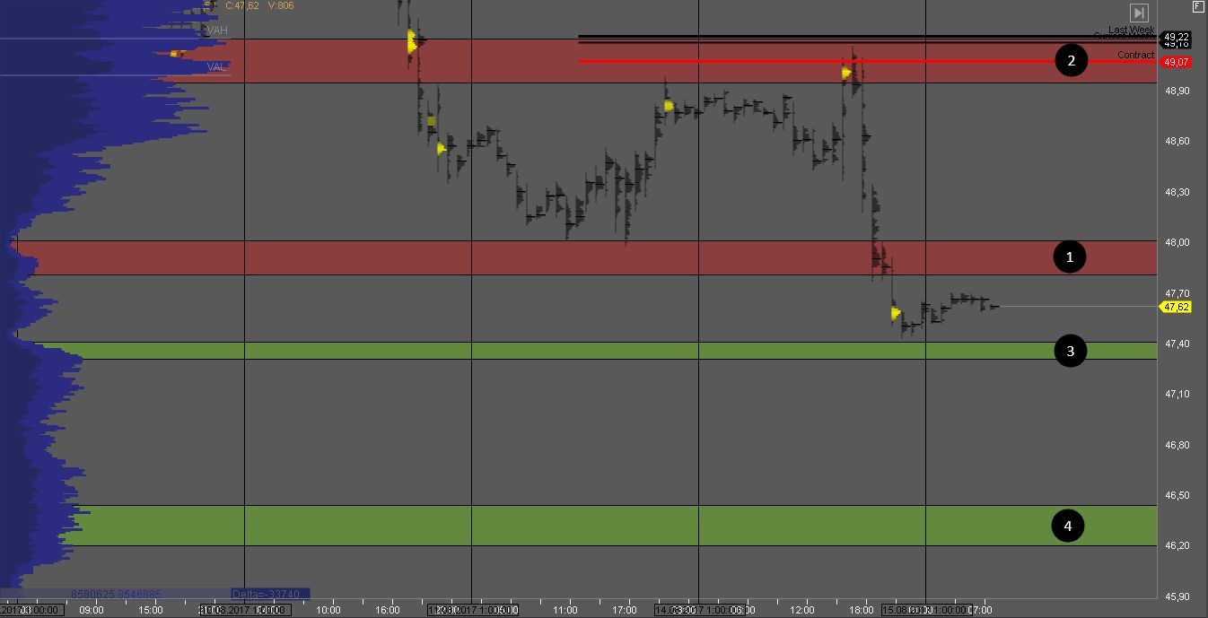 На тесте зоны 1 можно искать возможности для продажи с целями 3 и 4. Если зона 1 будет пробита, коррекция может быть более глубокой, пока не сформируется внутридневной разворот и продавец снова не перехватит инициативу.