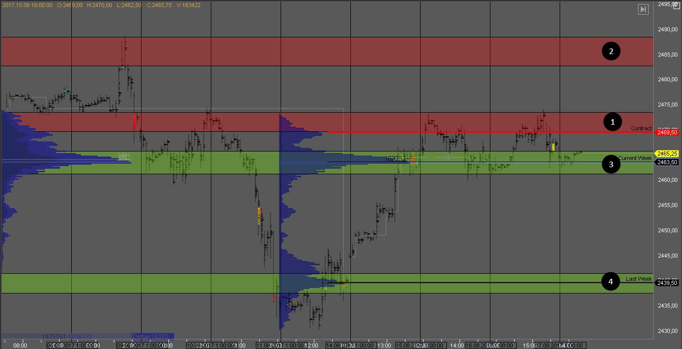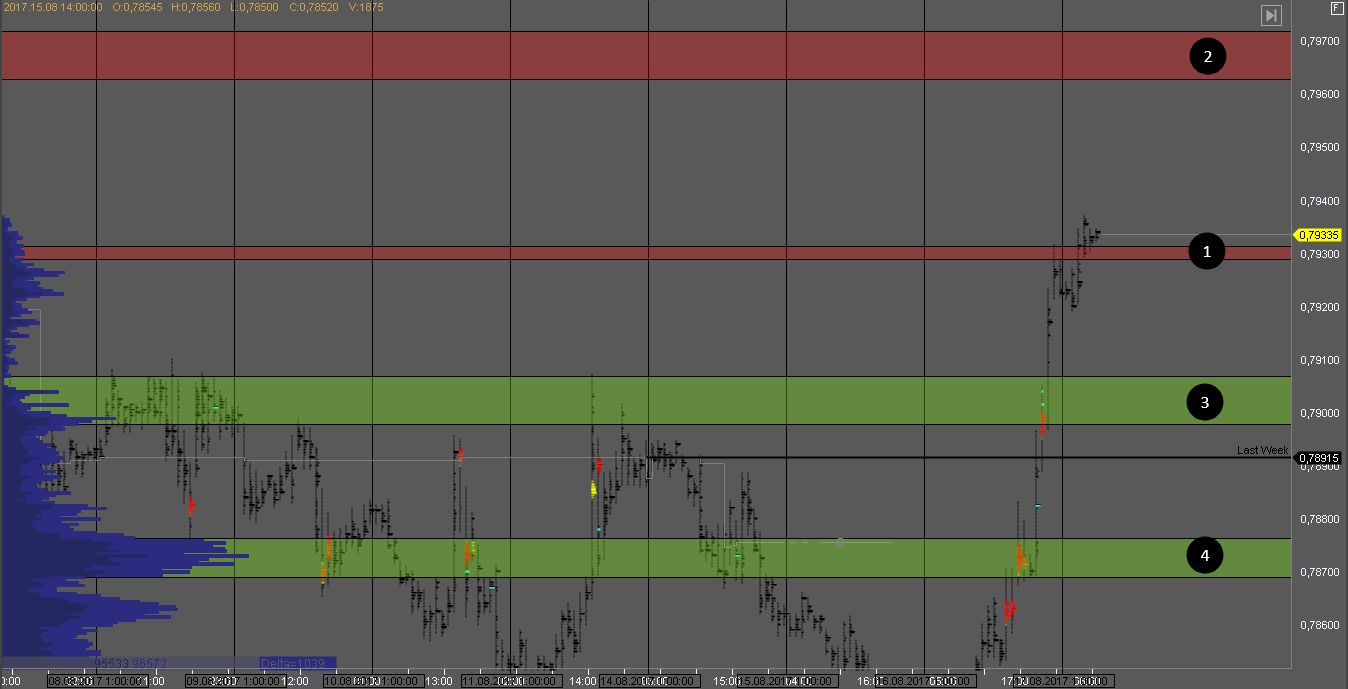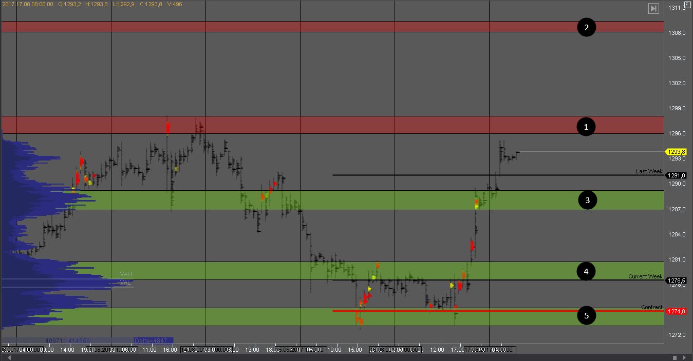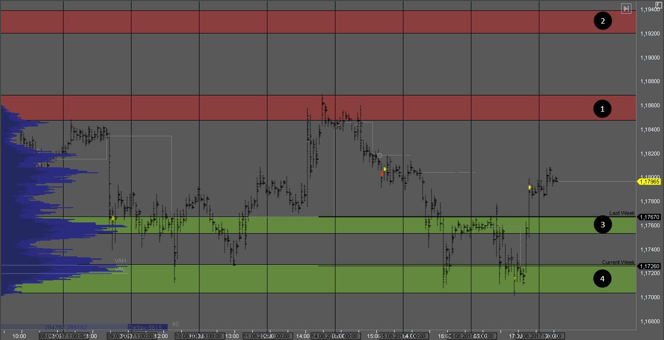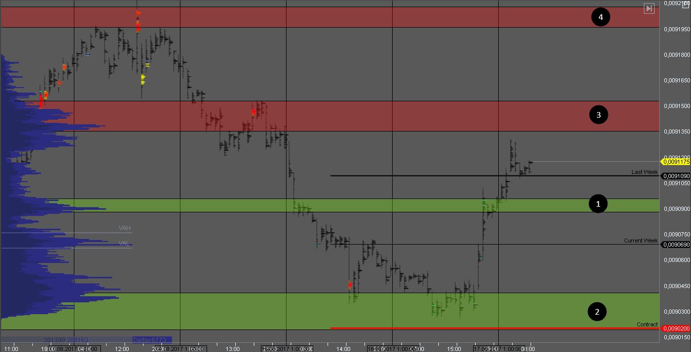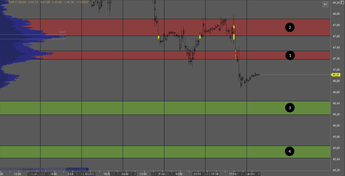 Объем продавца сформировался в зонах 1 и 2. На их тестах стоит искать возможности для продаж. Цели снижения - в зонах 3 и 4.