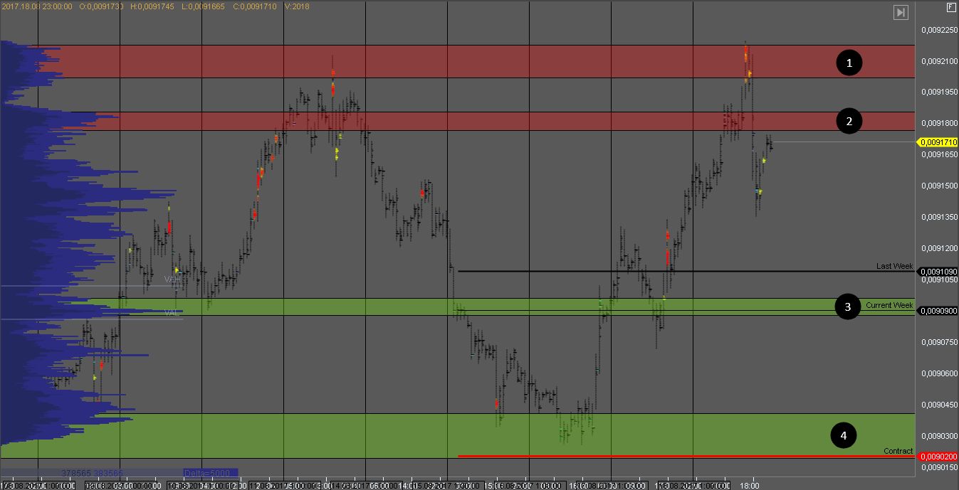 Покупатель на йене попытался пробить экстремум, но продавец на крупных кластерах развернул котировку. На тестах зон 2 и 1 можно искать возможности для продаж. Цель - в зоне 3.