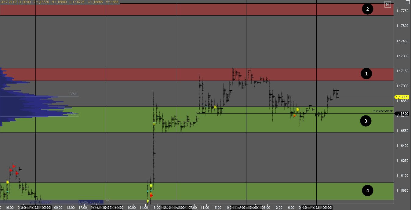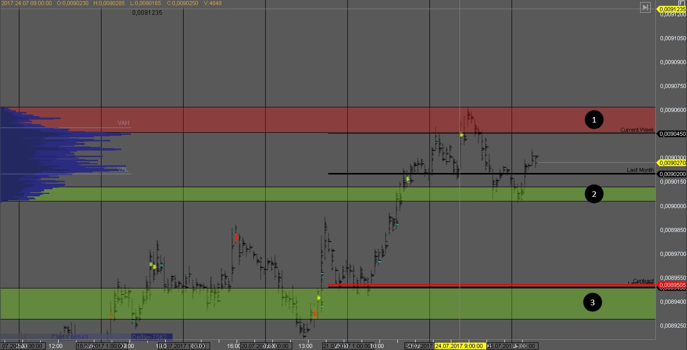 Покупатель на данный момент взял под контроль котировку пробив объем продавца и сформировав поддержку с объемом в зоне 1.