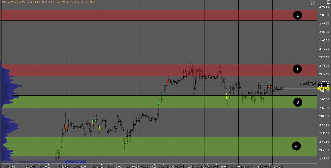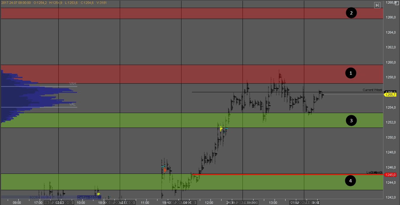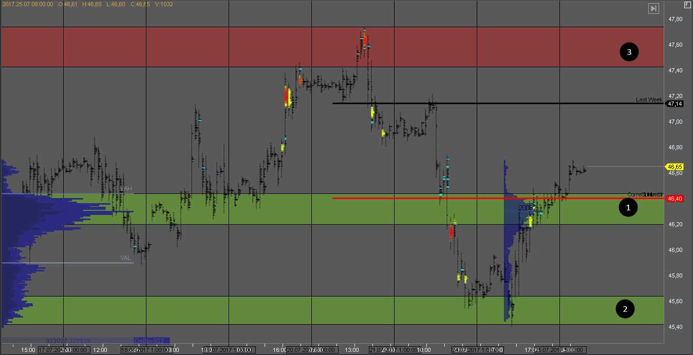 На золоте так же формируется объем в локальной консолидации с границами 1 и 3. На их тестах могут возникать краткосрочные возможности на отскок внутри дня.