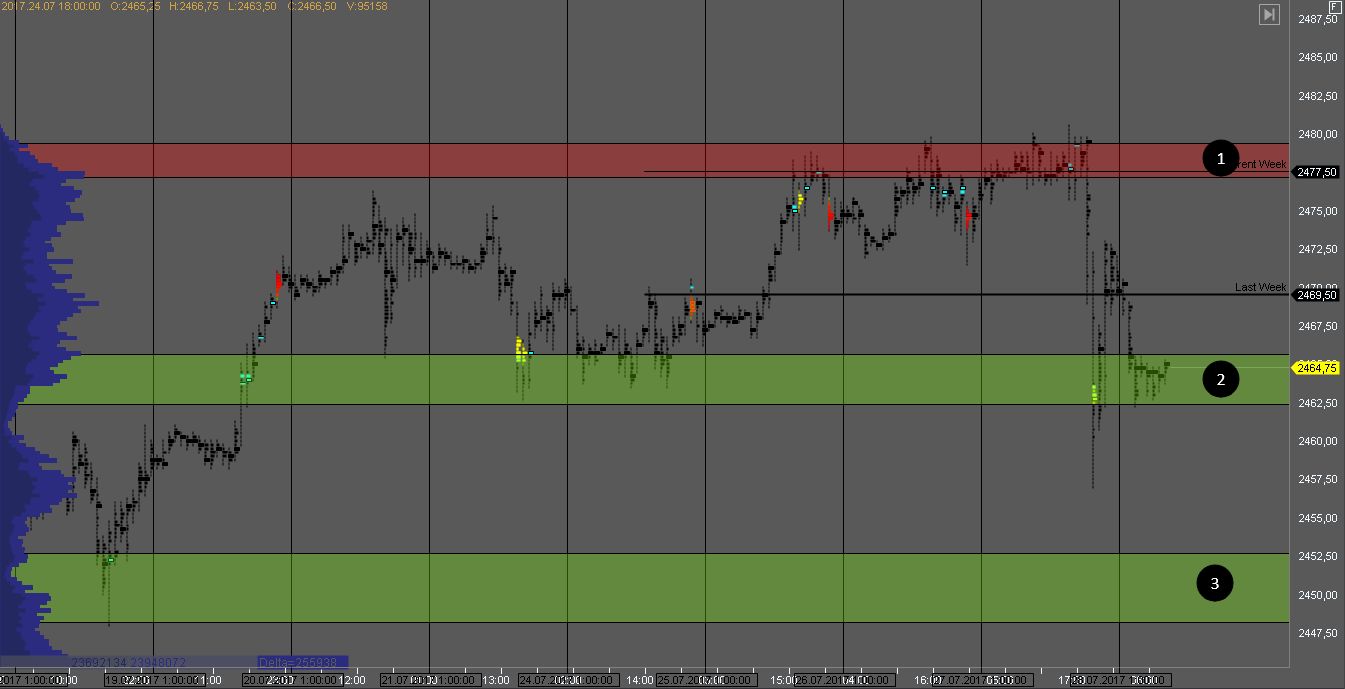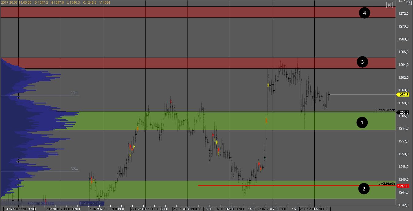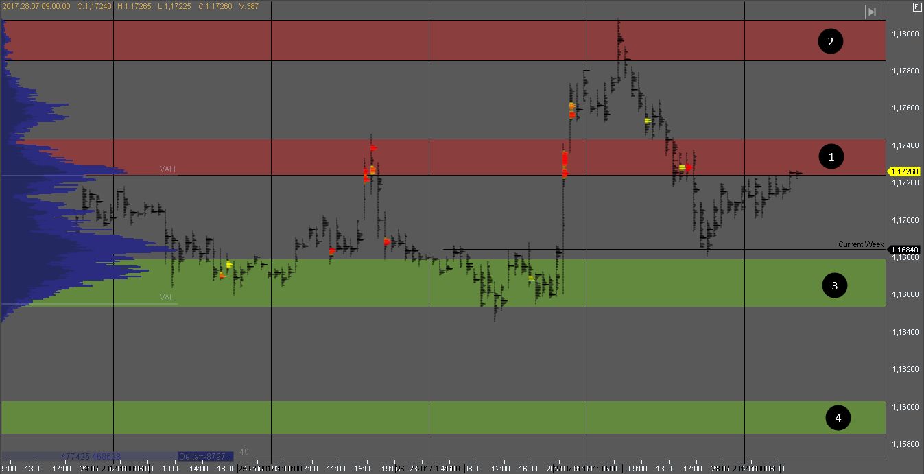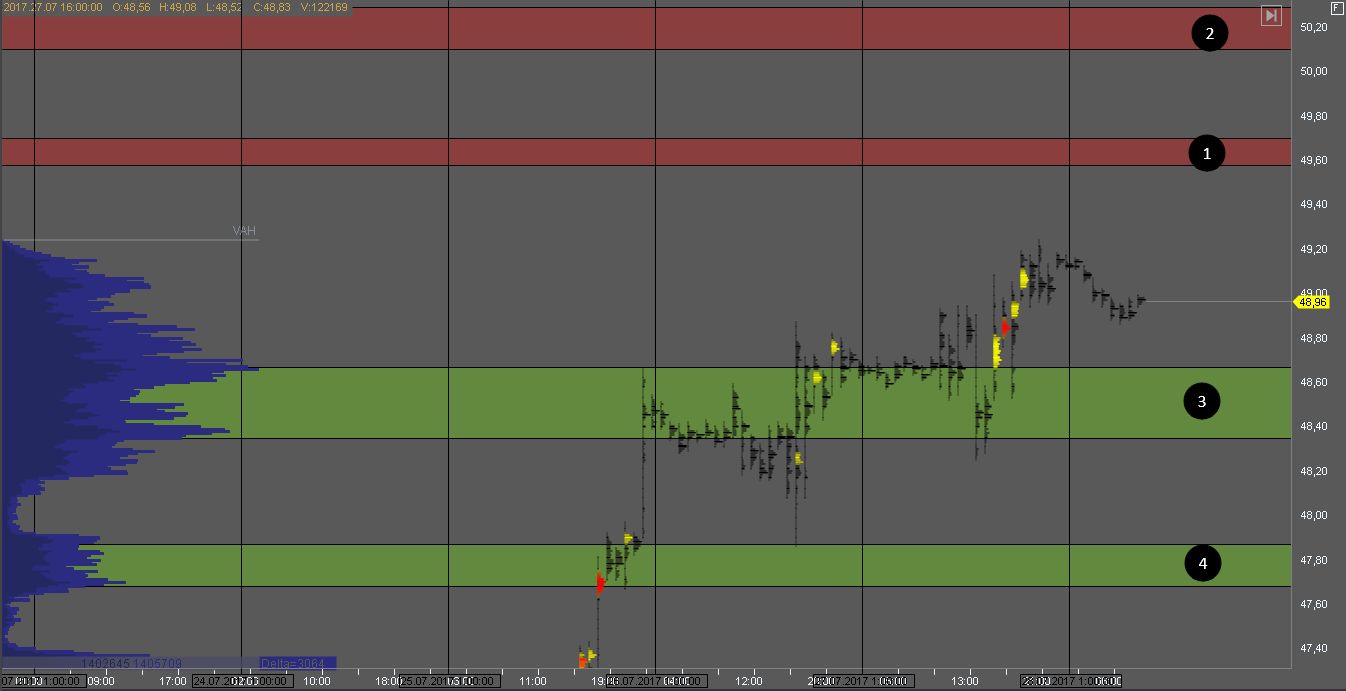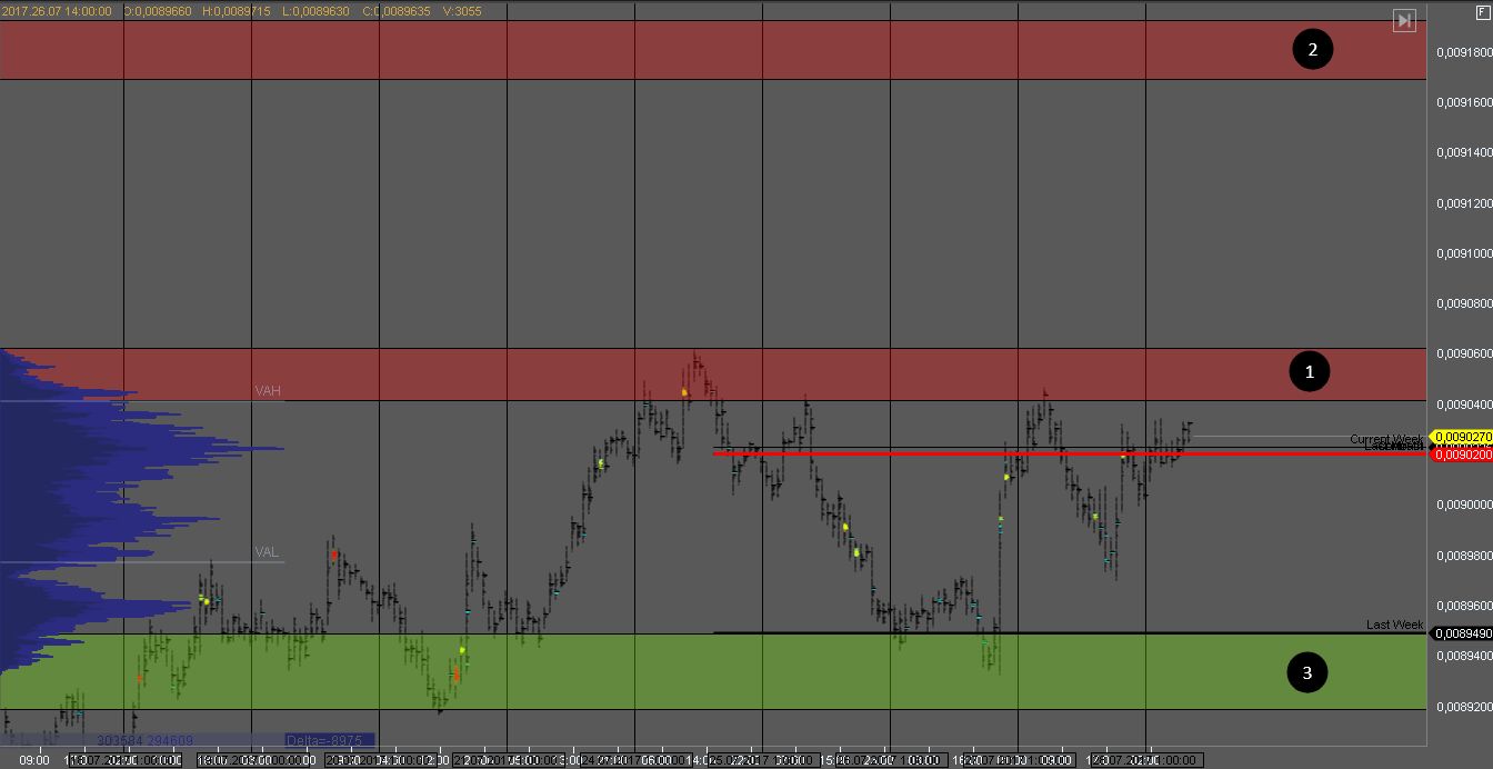 Продавец удержал котировку в зоне 1 сформировав крупные кластера объема. На данный момент продавец тестирует объем покупателя в зоне 2. На ее тесте можно искать возможности для покупок.