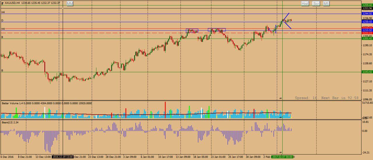 На данный момент продолжается восходящее движение с 15.12.2016 на ТФН4. Движение в лонг при закреплении цены над уровнем 1230.16, цель- 1244.66. Нисходящее движение возможно при закреплении под уровнем 1230.16. Цель – 1219.04.