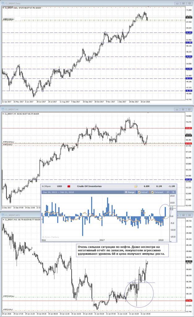 Вот один из наглядных эпизодов на примере реально проведенной сделки по нефти марки Брент незадолго до выхода запасов нефти на складах в США.