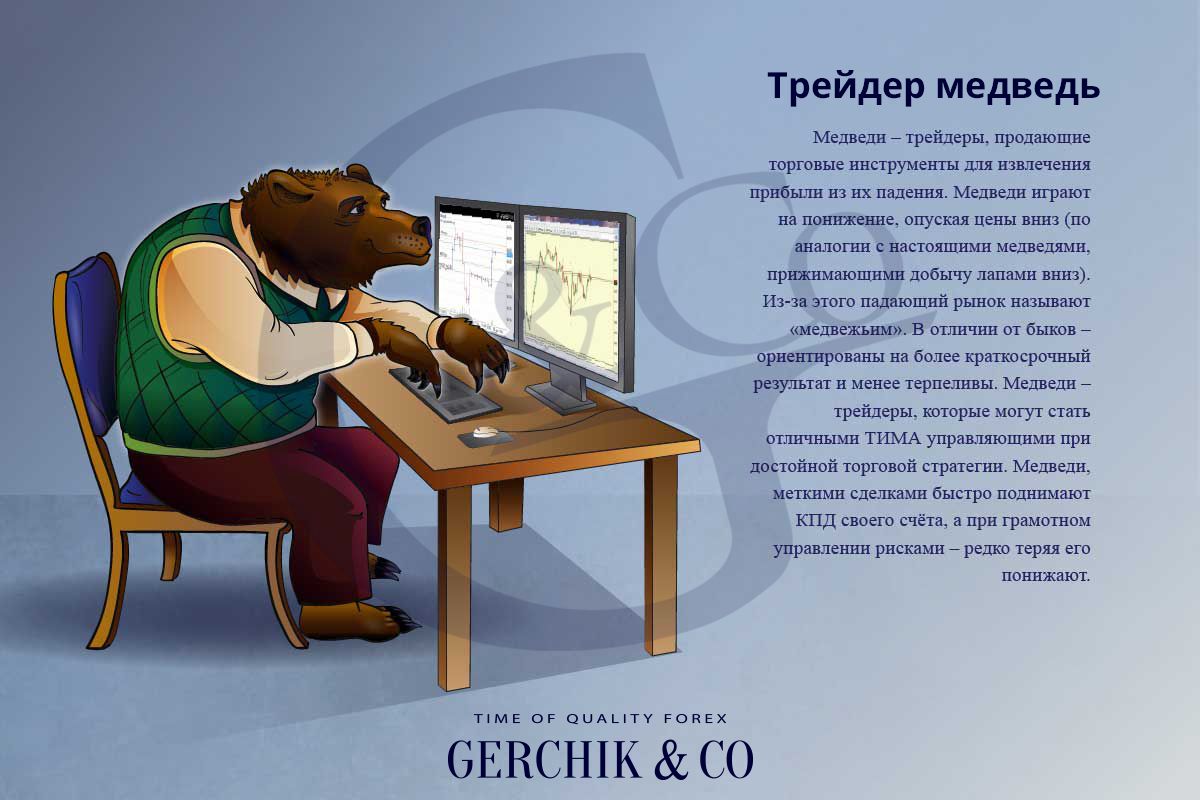 Медведь – трейдер, предпочитающий извлекать прибыль из падения рынка, так же, как настоящий медведь, прижимает добычу. Снижение цены на валютную пару называют «медвежьим» рынком.