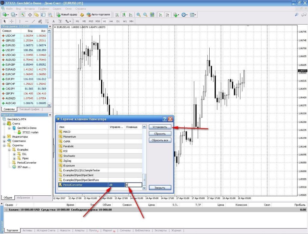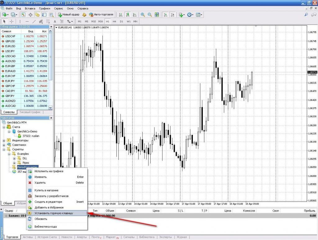 Выберите нужный раздел и правой клавишей мыши нажмите на конкретном скрипте, советнике или индикаторе. У вас появится возможность установить горячую клавишу.