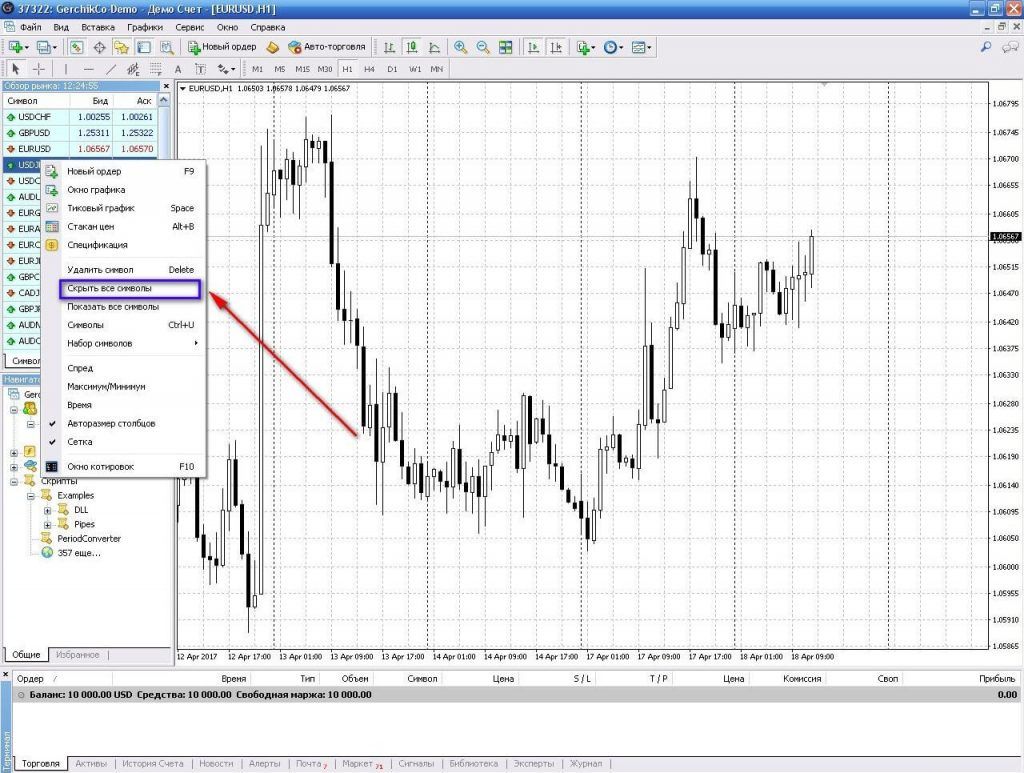 В сплывающем окне у вас появится опция – скрыть все. В результате, у вас спрячутся все валютные пары, кроме тех, чьи графики открыты.