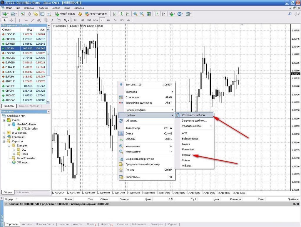 Для этого, щелкаем правой мышей на графике, где уже все нужное установили, и выбираем опцию Шаблон – сохранить шаблон. Придумываем название для шаблона.