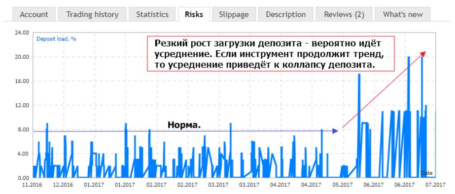 Здесь при присутствии периодичного наращивания кредитного плеча повышается вероятность торговли по Мартингейлу (усреднение), что показало уже не раз на практике, очень рискованное его применение.