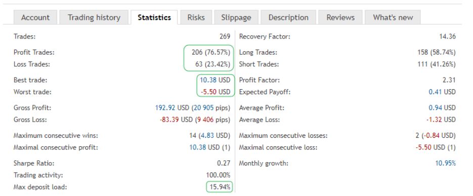 Если мы видим, что кроме хорошего соотношения прибыльных и убыточных сделок, торговый сигнал не допускает убыточную сделку выше прибыльной и средняя величина прибыльных сделок выше убыточных, то мы понимаем, что кроме высокого показателя процента прибыльных сделок в случае изменения рынка, доходность ещё формируется за счёт положительного соотношения между прибыльными и убыточными сделками, то есть достаточный запас прочности.