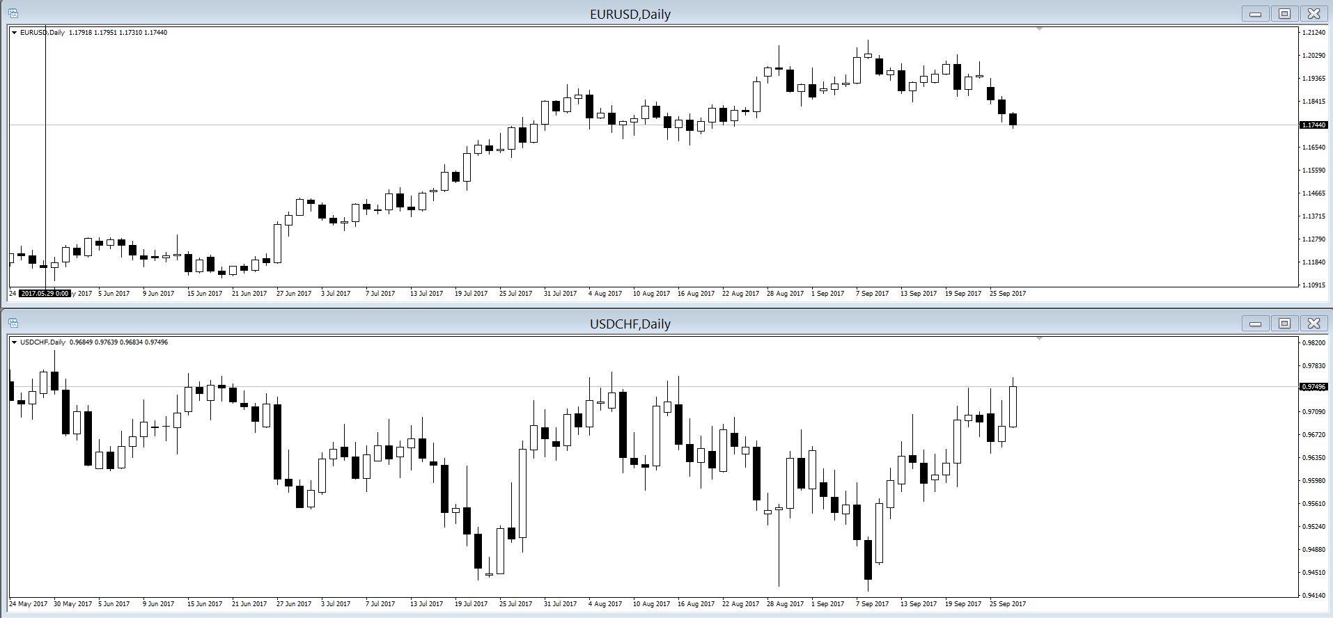 Наверное, каждый даже начинающий трейдер замечал похожее поведение графиков разных валютных пар. Достаточно посмотреть на одни из самых популярных котировок: EUR/USD и USD/CHF.