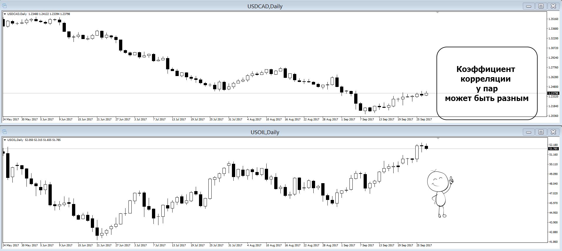 • С другой стороны, игнорирование закономерностей взаимосвязанности также становится причиной убытков. Например, так как Канада является одним из лидеров по добыче нефти, корреляция цены нефти и курса канадского доллара достаточно сильная. От изменений цены на нефть напрямую зависит курс валютной пары USD/CAD. Поэтому, если вы ведёте торги с этой парой, отслеживайте изменения курса нефти.