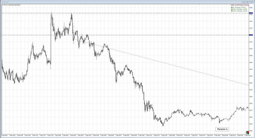 Агрессивная сделка по нефти марки WTI, где инструмент дважды не смог обновить свои локальные максимумы и уже пошёл на пробой 57.25 (рис.2). И реализация (рис.3).